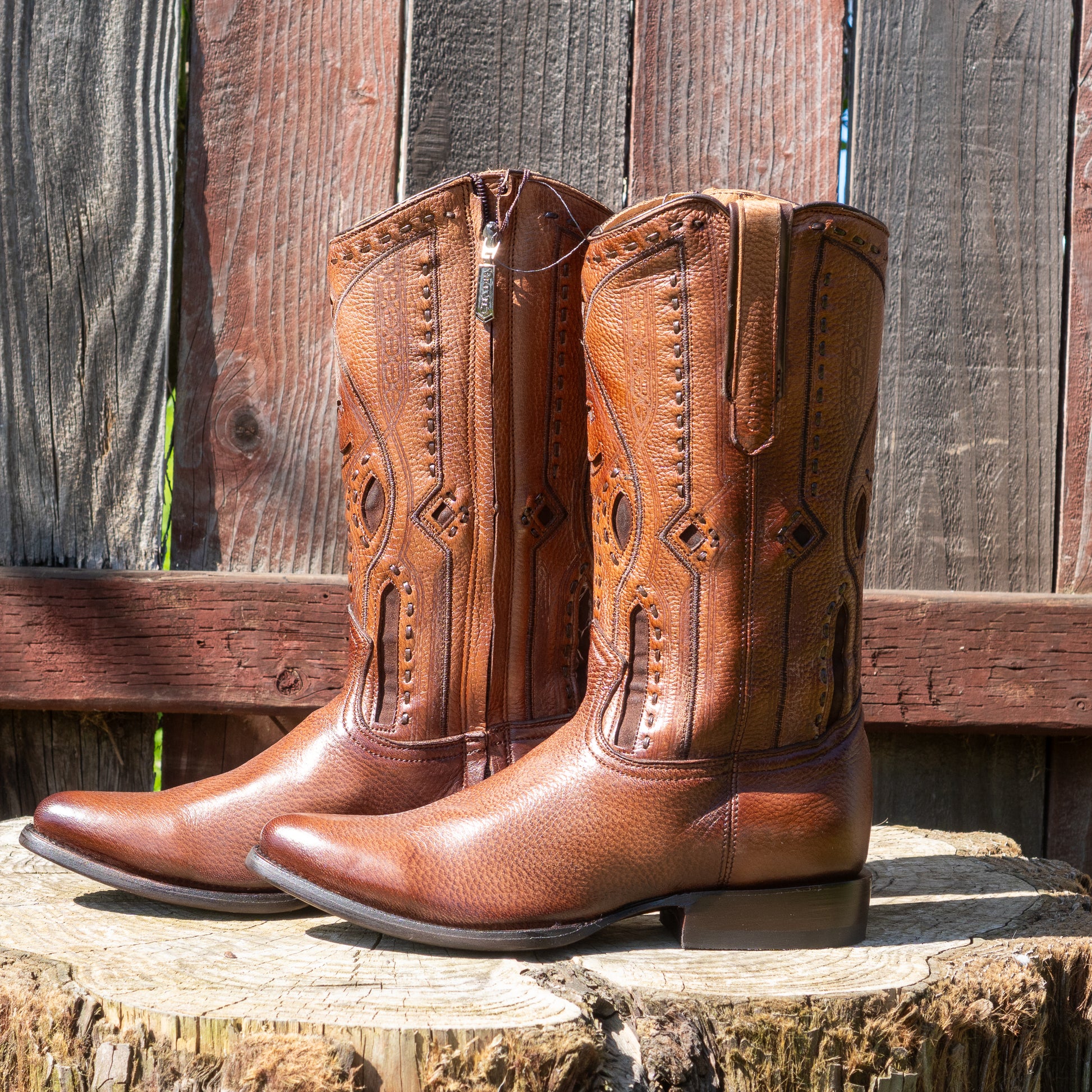 Cuadra Men's Exotic Almond Deer Leather Laser Embroidery and Zipper Round Toe Cowboy Boots