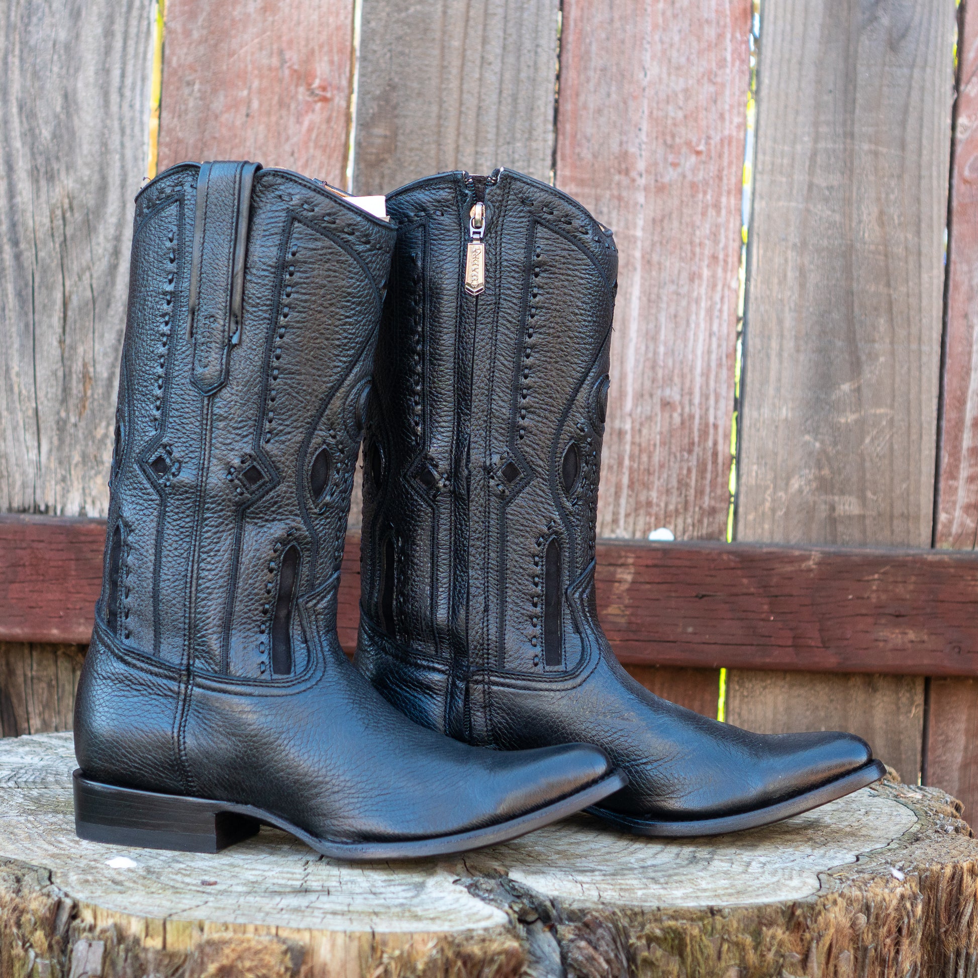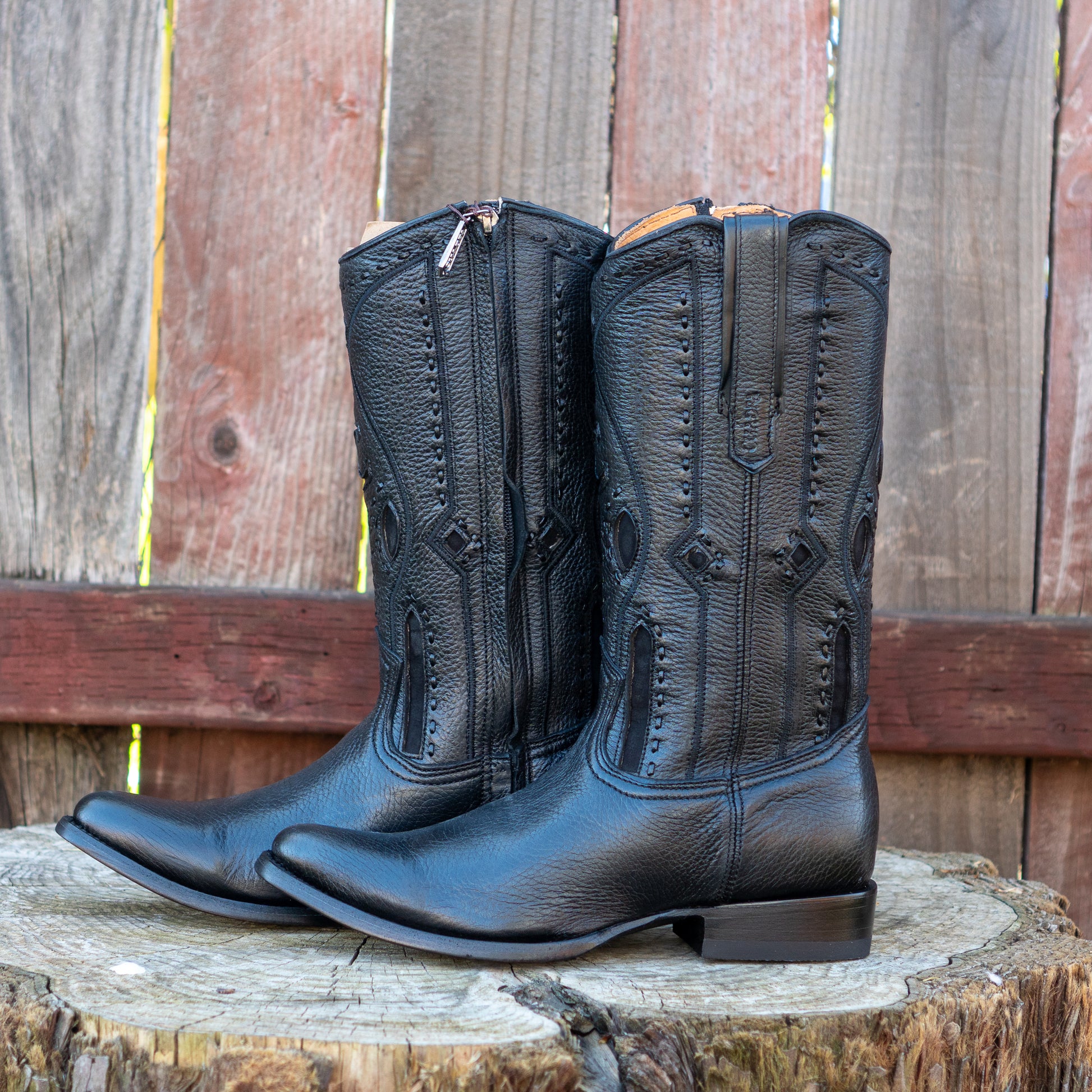 Cuadra Men's Exotic Black Deer Leather Laser Embroidery and Zipper Round Toe Cowboy Boots